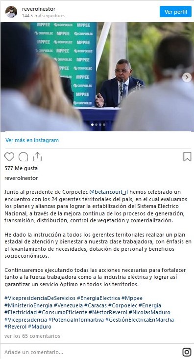 Reverol, en el encuentro gerencial, tocó el tema de las acciones a tomar con el fin de avanzar con el plan de atención para atender las necesiadade de los trabajadores del sector eléctrico.