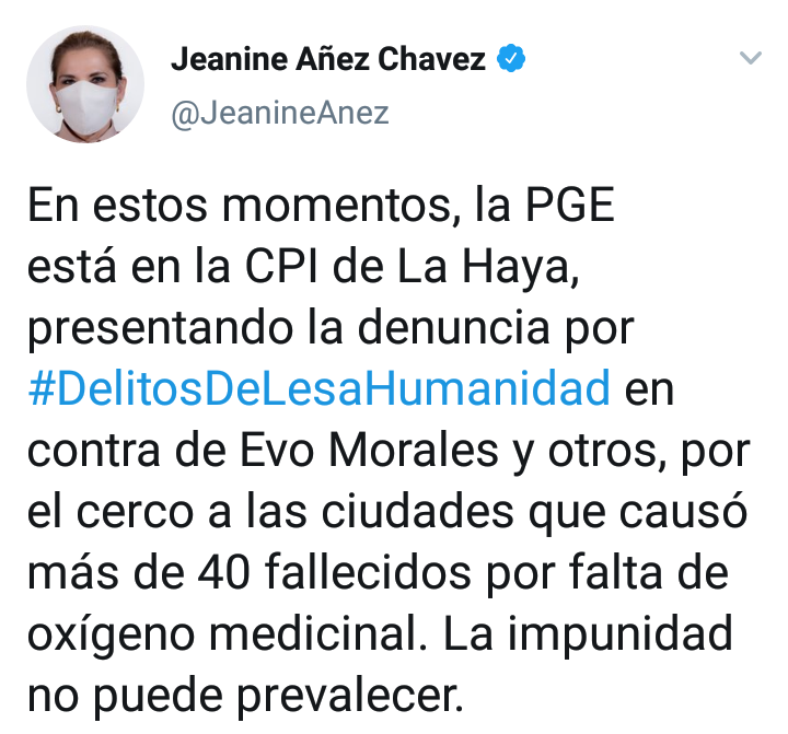Por su parte, la mandataria boliviana en su cuenta de Twitter expresó con ahínco que la impunidad no debe «prevalecer», añadió además que, no se puede dejar que «el mas perverso de los abusos de poder que se ha cometido en Bolivia quede impune»