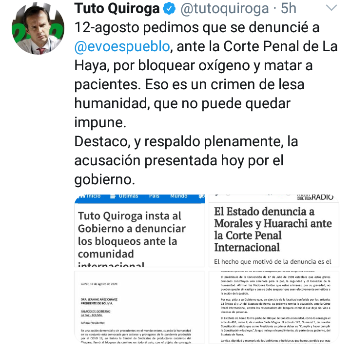 Jorge Quiroga expresidente de Bolivia, desde su cuenta de Twitter había hace día exhortado al gobierno de Áñez acudir a La Haya para acusar a Morales, luego del comunicado de la Fiscalía, Quiroga publicó en su red social «Destaco, y respaldo plenamente, la acusación presentada hoy por el gobierno en su contra»