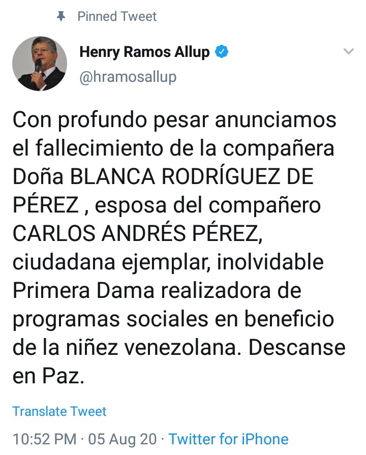 Por su parte al conocer la noticia el político y dirigente de Acción Democrática Henry Ramos Allup manifestó su pesar por el fallecimiento de la exprimera dama.