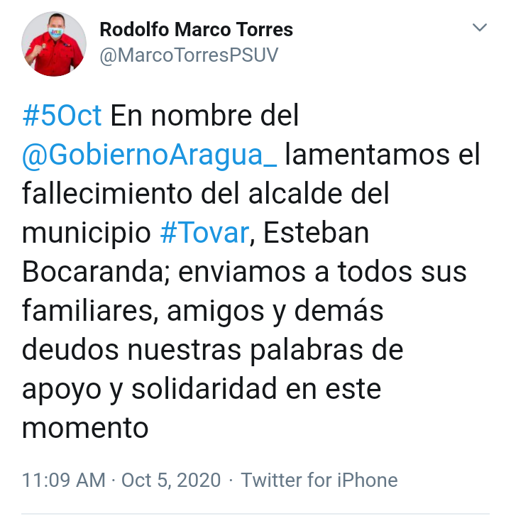 Esteban Bocaranda alcalde de la Colonia Tovar falleció este lunes 5 de septiembre por Covid-19, así lo anunció Rodolfo Marco Torres Gobernador del estado Aragua.