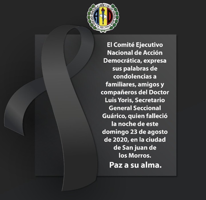 El dirigente político del partido Acción Democrática AD, Luis Yoris, falleció el domingo 23 de agosto en un hospital centinela, específicamente en el Israel Ranuárez Balza, San Juan de los Morros estado Guárico.