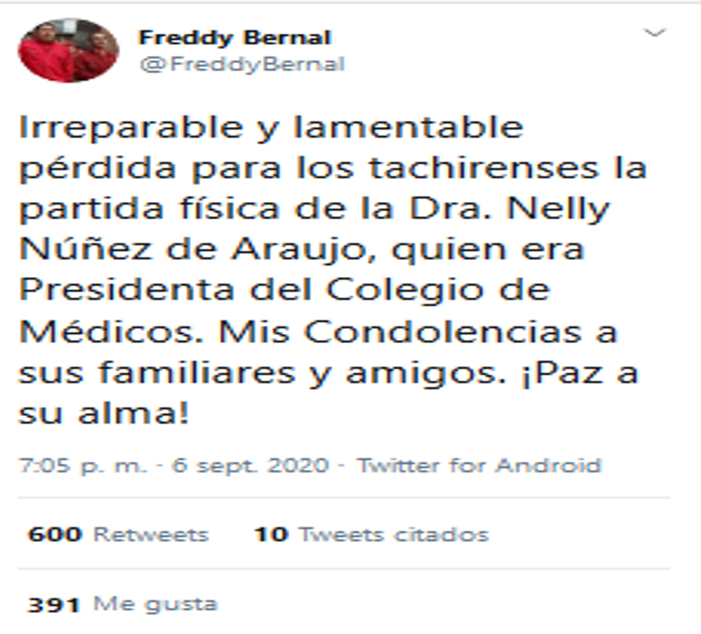 Nelly Nuñez de Araujo quien fungía como presidenta del Colegio de Enfermeros del estado Táchira falleció este domingo. Dicha información, fué confirmada por el protector del estado, Freddy Bernal a través de sus redes sociales.