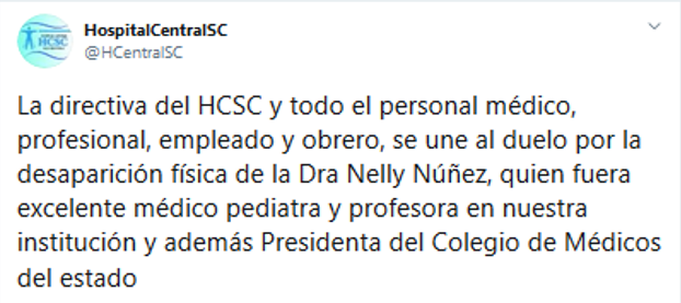 Por su parte el Hospital Central de San Cristóbal, también mostró su pesar por el deceso de la profesional de la salud.