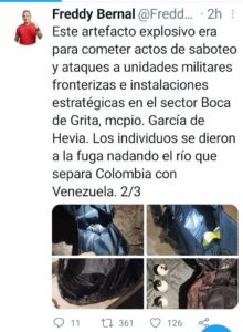 Bernal advirtió que intentaban cometer «actos de saboteo y ataques» a unidades militares fronterizas e instalaciones estratégicas en el sector Boca de Grita, en el municipio García de Hevia, en la entidad andina.