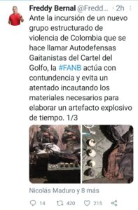 Explicó que se trata de un nuevo «grupo de violencia de Colombia» que se hace llamar Autodefensas Gaitanistas del Cartel del Golfo, los cuales se dieron a la fuga nadando por el río que separa a Venezuela de la nación neogranadina.
