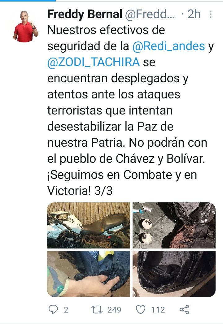 A través de su cuenta en la red social Twitter, el protector del estado Táchira, Freddy Bernal, informó que efectivos de la Fuerza Armada Nacional Bolivariana (FANB), lograron incautar varios materiales con los que se elaboran arfefactos explosivos.
