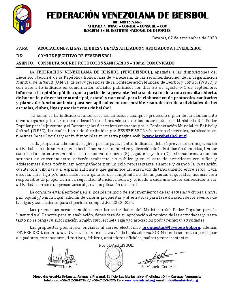 A través de un comunicado emitido en su página oficial y redes sociales, la Federación Venezolana de Beisbol (FVB) propuso el inicio de una consulta pública para la posible reanudación de actividades asociaciones, clubes y ligas.