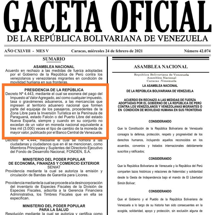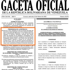 La medida que comenzó a regirse este jueves 25 de febrero, corresponde al decreto 4443 publicado en Gaceta Oficial mediante la cual se exonera del pago de impuesto del valor agregado, tasa o gravámenes aduaneros a las mercancías que ingresen al territorio aduanero nacional, que formen parte del equipaje de los pasajeros procedentes de la Zona Libre para la Inversión Turística en el estado Falcón, o de Nueva Esparta.