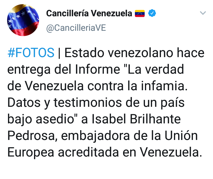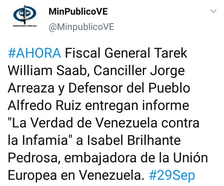 Jorge Arreaza canciller de la República, Tareck William Saab Fiscal General y Alfredo Ruíz entregaron el informe de DDHH «La verdad de Venezuela contra la Infamia» a la embajadora de la Unión Europea en el país Isabel Brilhante Pedrosa.