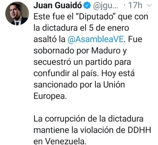 El líder político opositor Juan Guaidó a través de su cuenta Twitter indicó que el diputado Luis Parra fue «sobornado» por el presidente de la República con el propósito de crear confusión.