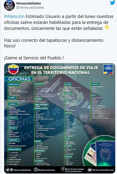 El Servicio Administrativo de Identificación, Migración y Extranjería (SAIME) anunció a través de sus canales oficiales que partir de este lunes comenzarán a prestar servicio al público en gran parte de sus sedes a nivel nacional para la entrega de documentos.