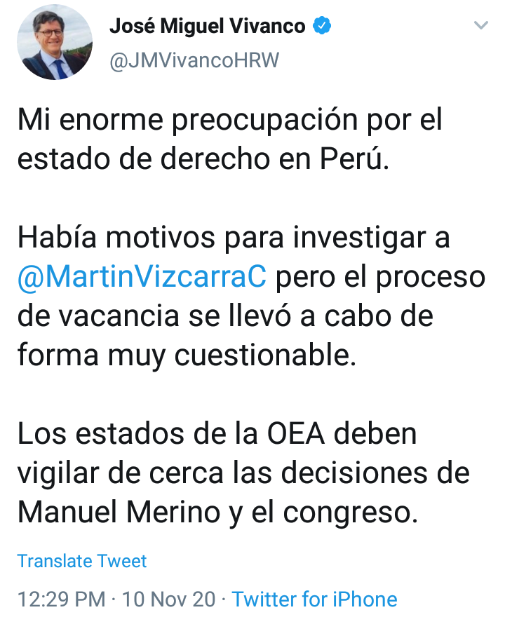 «Mi enorme preocupación por el estado de derecho en Perú. Había motivos para investigar a Martin Vizcarra, pero el proceso de vacancia se llevó a cabo de forma muy cuestionable”, alertó Vivanco.