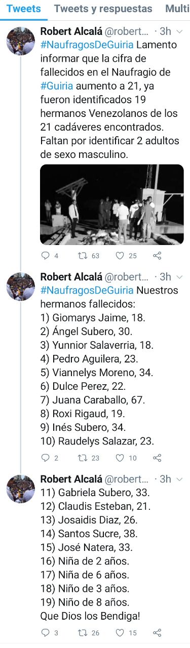 «Lamento informar que la cifra de fallecidos en el naufragio de Güiria aumentó a 21, ya fueron identificados 19 hermanos venezolanos de los 21 cadáveres encontrados. Faltan por identificar dos adultos de sexo masculino”.