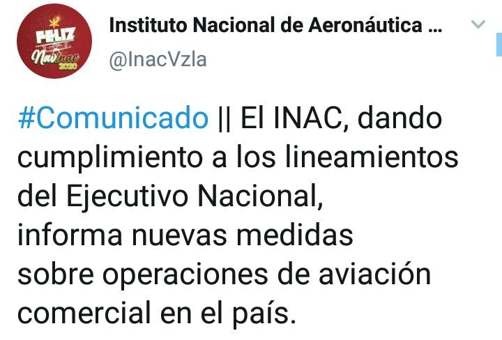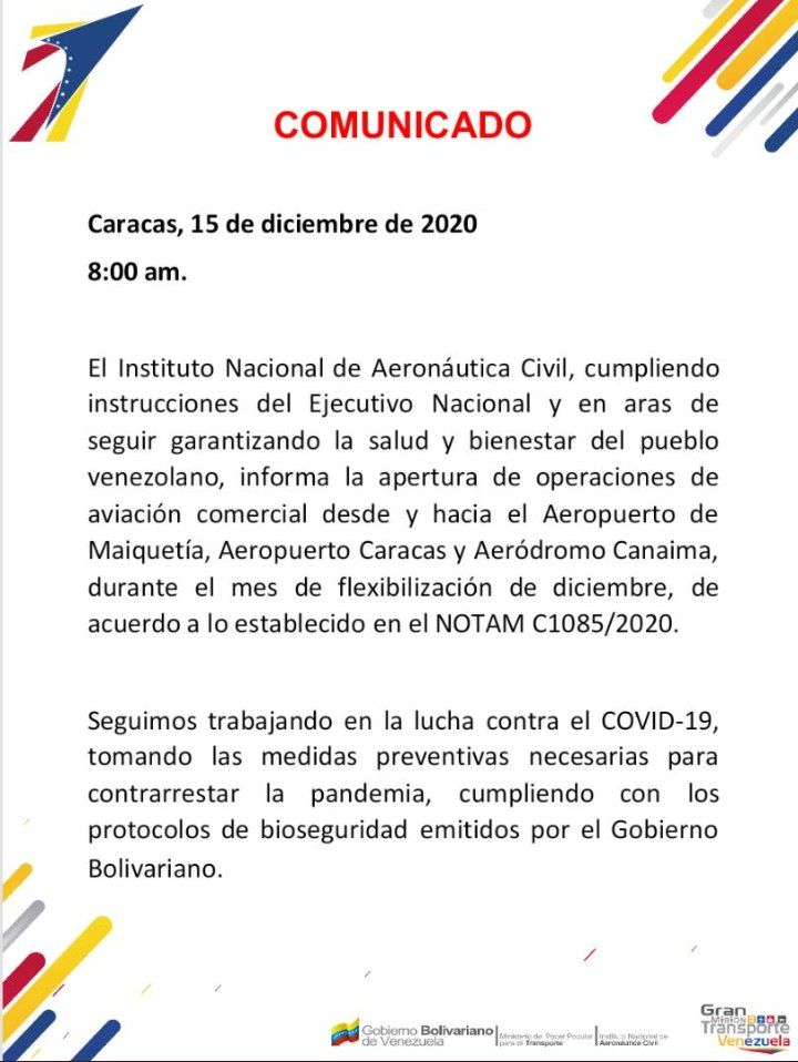 El INAC Instituto Nacional de Aeronáutica Civil informó que la apertura de las operaciones de aviación comercial desde y hacia el aeropuerto de Maiquetía, aeropuerto Caracas y aeródromo Canaima, por el mes de relajación de diciembre como lo decretó el Ejecutivo Nacional.