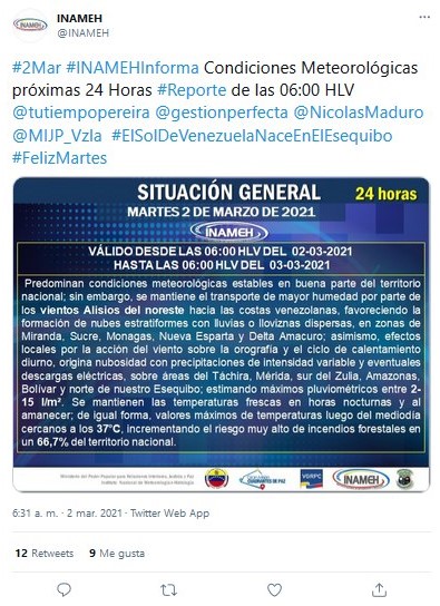 El Instituto Nacional de Meteorología e Hidrología pronostica para la jornada de este 2 de marzo que las condiciones meteorológicas estables en buena parte del país, no obstante, se mantendrá la humedad por parte de los vientos Alisios del noroeste en las costas venezolanas generando nubosidad y lluvias o lloviznas dispersas en zonas como Miranda, Sucre, Monagas, Nueva Esparta y Delta Amacuro además de efectos locales por la acción del viento.