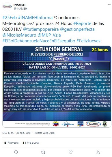 El Instituto de Meteorología e Hidrología prevé que los vientos alisios de noroeste favorecen nubosidad de desarrollo mediano con lluvia o lloviznas dispersas en zonas de Nororiente, Centro Norte Costero, Centro Occidente, Cojedes, Nueva Esparta, Delta Amacuro y el Esequibo.