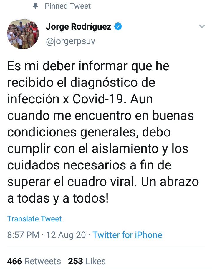El ministro del Poder Popular para la Comunicación e Información a través de su red social de Twitter comunicó que acaba de recibir el diagnóstico de infección por covid-19.