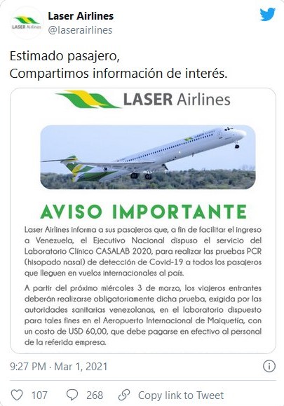 Laser Airlines informó a sus pasajeros que deseen ingresar a Venezuela mediante el aeropuerto internacional Simón Bolívar en Maiquetía pueden pagar 60 dólares en efectivo para la prueba PCR que demanda las autoridades sanitarias.