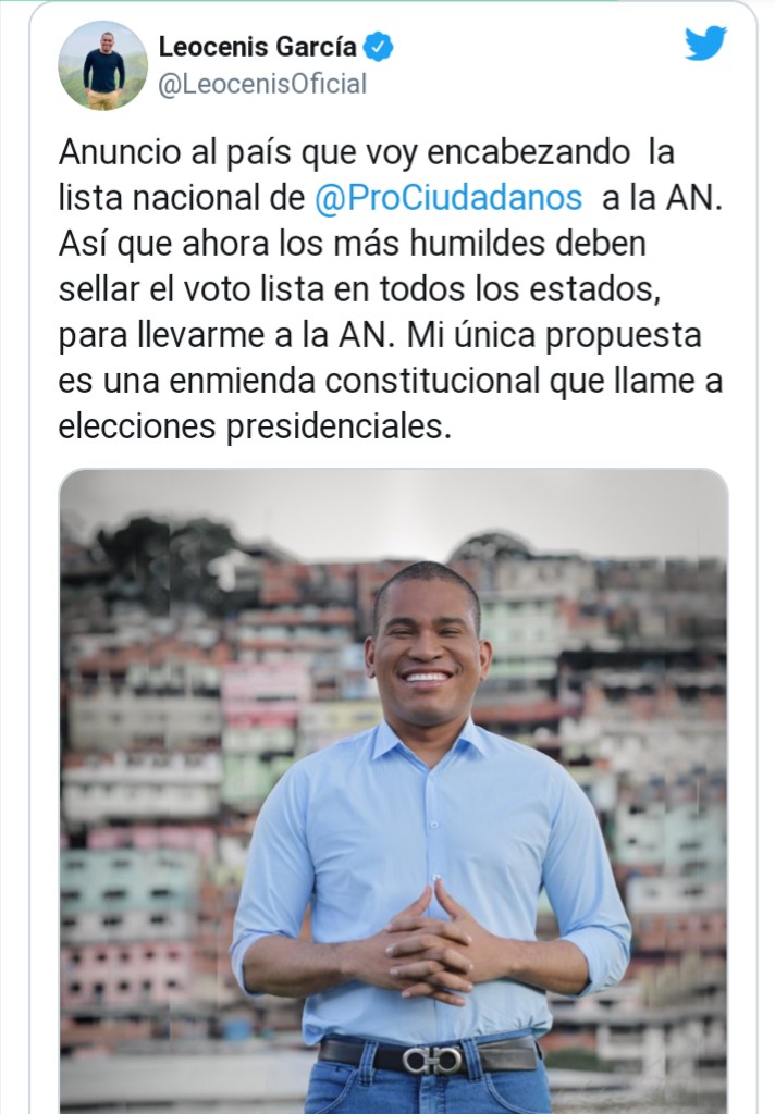 El dirigente del movimiento ProCiudadanos, Leocenis García, expresó su intención de participar en las elecciones parlamentarias del próximos 6 de diciembre.