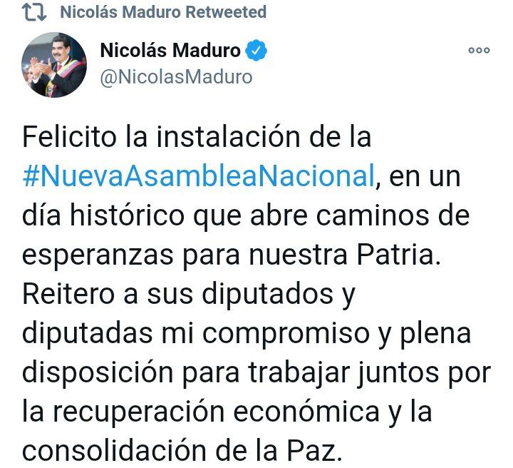 «Extraordinaria intervención de nuestro hermano de lucha Jorge Rodríguez, quien asume la Presidencia del Parlamento venezolano hasta el 2022. Me sumo a sus palabras, es tiempo de sanación y reconciliación política para avanzar en las grandes tareas que aguardan por todas y todos», manifestó el mandatario venezolano en otro mensaje en la red social.