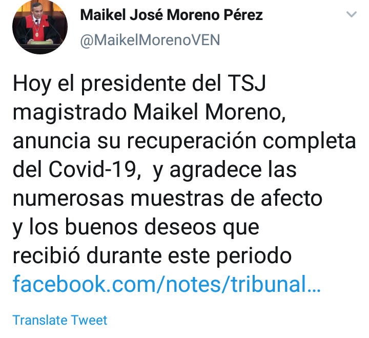 El presidente del Tribunal Supremo de Justicia Maikel Moreno anunció este miércoles 16 de septiembre que se ha recuperado en su totalidad de la covid-19.