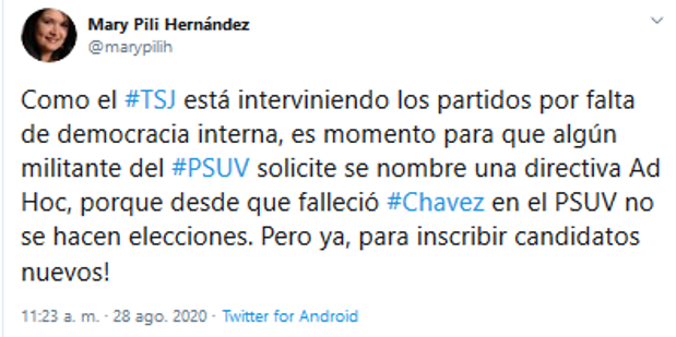«Como el TSJ está interviniendo los partidos por falta de democracia interna, es momento para que algún militante del PSUV solicite se nombre una directiva Ad Hoc, porque desde que falleció Chávez en el PSUV no se hacen elecciones. Pero ya, para inscribir candidatos nuevos», escribio en su cuenta de Twitter.
