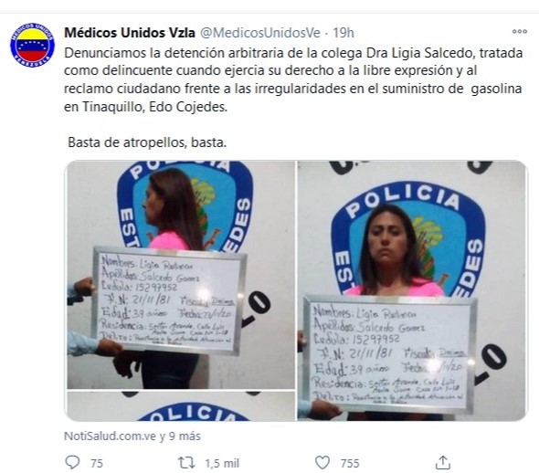 La Organización No Gubernamental (ONG), Médicos Unidos Venezuela, denunció que funcionarios policiales en Tinaquillo, detuvieron a la doctora Ligia Salcedo cuando hacía un reclamo por el despacho irregular del combustible, en una estación de servicios.