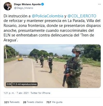 El ministro de defensa Diego Molano, a través de su cuenta de Twitter ordenó a la Policía colombiana y al Ejército “reforzar y mantener presencia en La Parada, Villa del Rosario, zona fronteriza, donde se presentaron disparos anoche, presuntamente cuando narcocriminales del ELN se enfrentaban contra delincuentes del Tren de Aragua”.