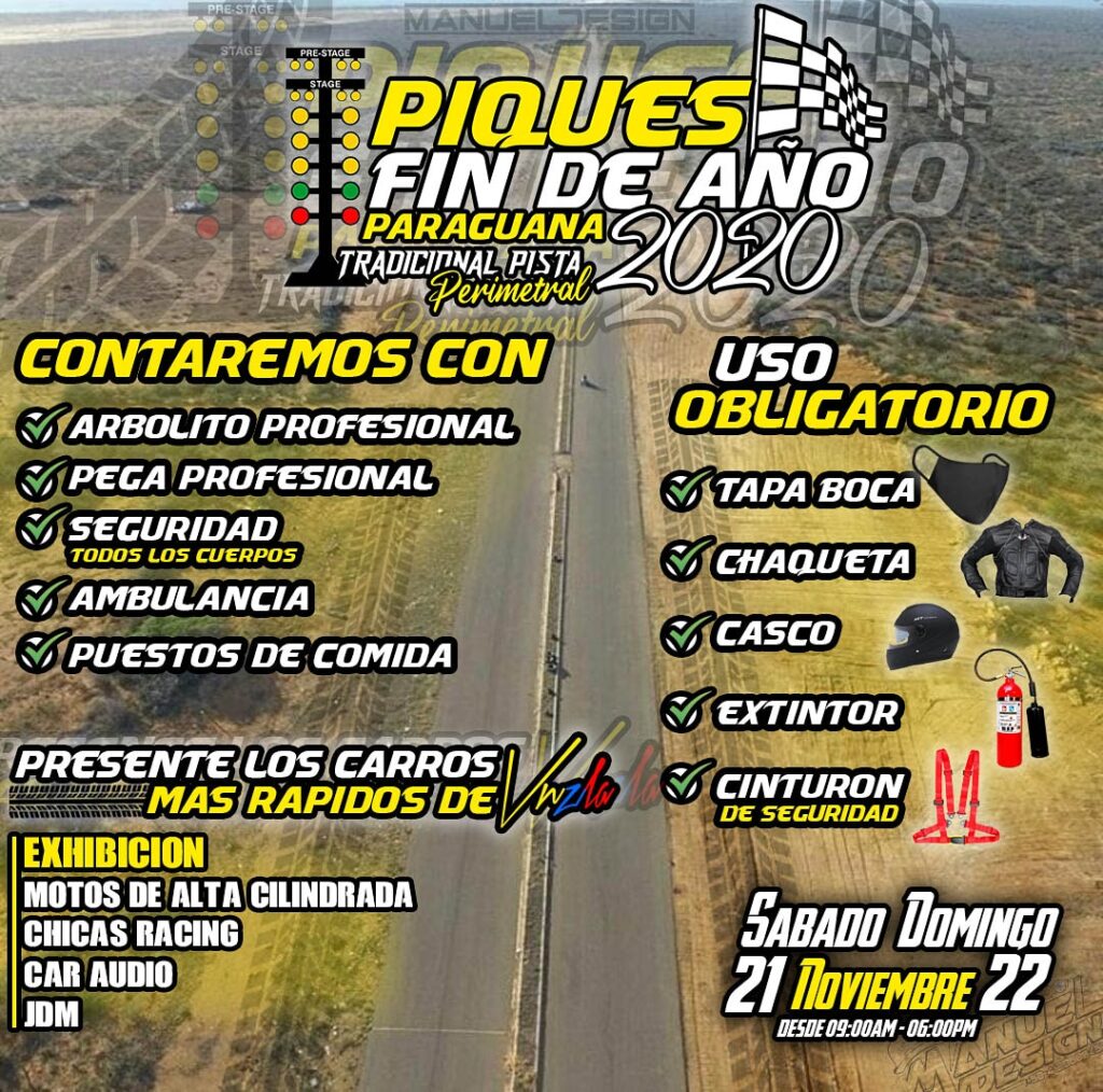 Romer González, organizador del evento señaló que contarán con presentación de los carros más rápidos de Venezuela y exhibiciones de motos de alta cilindrada. “Como medida de bioseguridad será obligatorio el uso del tapaboca y los participantes tendrán chaqueta, casco, extintores y cinturón de seguridad».
