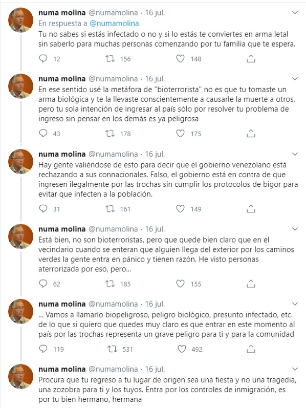 “La Compañía de Jesús rechaza los términos peyorativos utilizados por un religioso de esta congregación, con los que se ha referido a los migrantes en situación de retorno al país, pues ofenden la dignidad humana de los hermanos venezolanos que regresan al país en condición irregular debido a los controles desmedidos impuestos por el Ejecutivo Nacional, incluso antes de la pandemia del COVID-19″, dijeron tres días después del tuit de Molina.