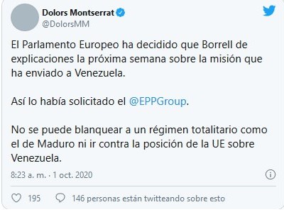 “El Parlamento Europeo ha decidido que Borrell de explicaciones la próxima semana sobre la misión que ha enviado a Venezuela. Así lo había solicitado el @EPPGroup.»
