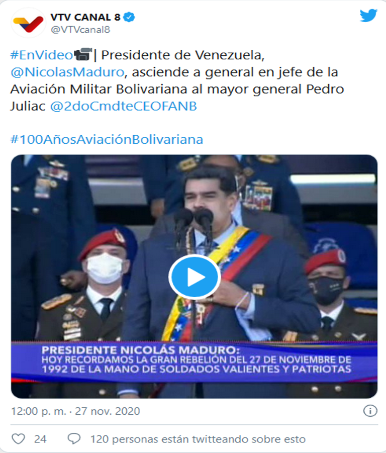 “He decidido ascender a General en Jefe de la Aviación Militar Bolivariana, al M/G Pedro Juliac. A partir del día de hoy será General en Jefe en el Centenario de la Aviación Militar Bolivariana”, añadió.