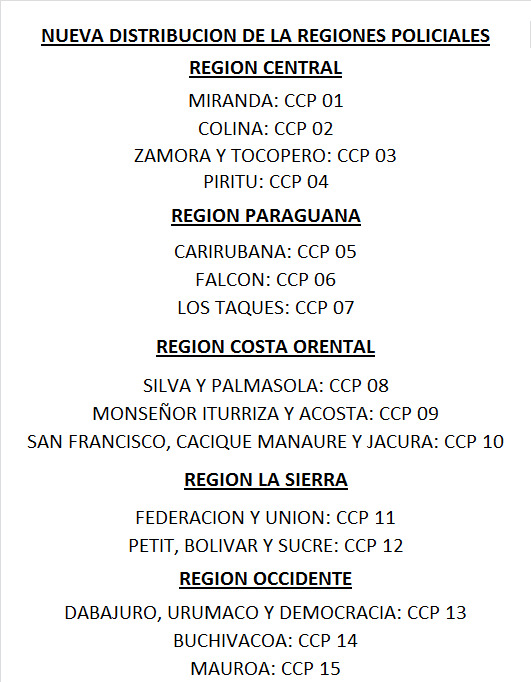 Así lo informó el director de este cuerpo policial y Secretario de Seguridad Ciudadana en Falcón, general de brigada Miguel Morales Miranda, quien destacó que la finalidad es apegarse a los lineamientos del Ministerio de Interior Justicia y Paz, aseverando que para reforzar la unidad de mando y jerarquización, en cada región se asignará a un comisionado agregado que supervisará dos tres Centros de Coordinaciones Policiales (CCP).
