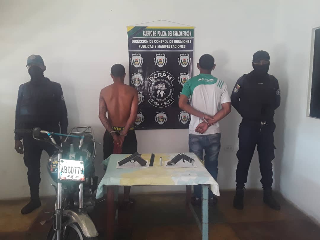 La aprehensión se practicó en las calles 4 y 9 de la Urbanización Cruz Verde de Coro. Los detenidos se desplazaban en una moto Empire azul, placas ABOD77B, portaban un “chopo” y un facsímil de arma de fuego.