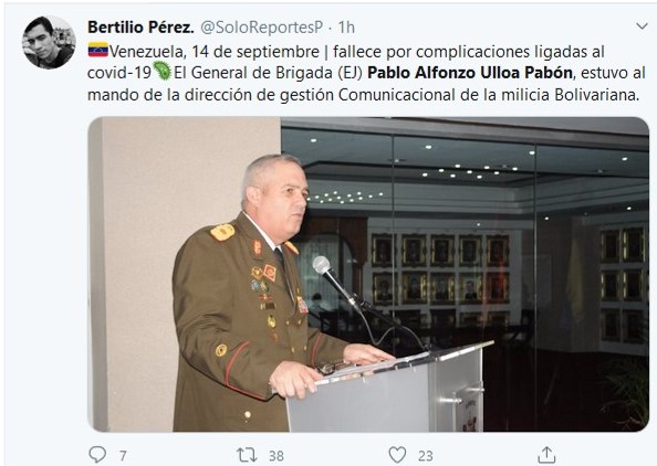 Este lunes 14 de septiembre, se reportó el fallecimiento del general de brigada del Ejército Venezolano Pablo Alfonzo Ulloa Pabón, a causa de coronavirus.