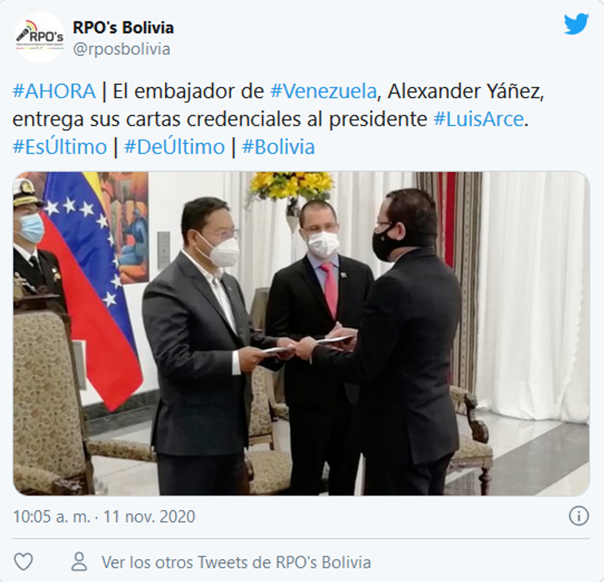 Luis Arce presidente de Bolivia recibió este miércoles las cartas credenciales del nuevo embajador de Venezuela Alexander Yánez.