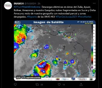 La institución indicó que podrían generarse precipitaciones en áreas del Zulia, Andes, Centro Occidente, Llanos Occidentales, Amazonas, Bolívar y el Esequibo.
