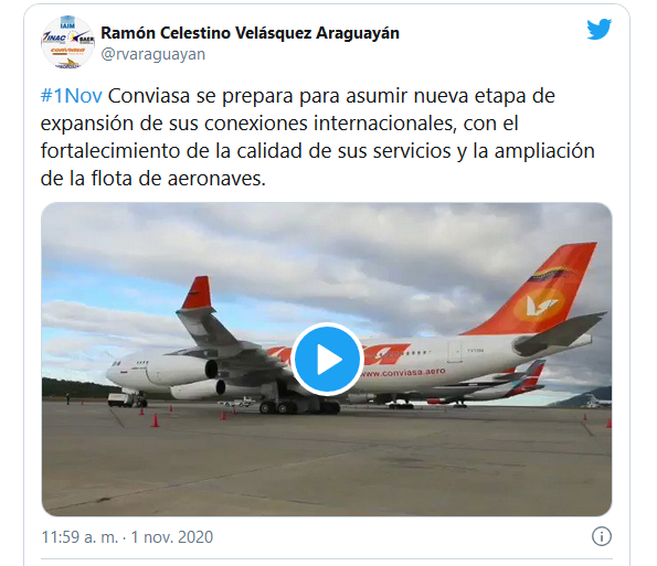 A través de la red social Twitter, el presidente del Consorcio Venezolano de Industrias Aeronáuticas y Servicios Aéreos (Conviasa), Ramón Velásquez Araguayán anunció el pasado domingo, 1 de noviembre, que será para diciembre cuando inicien los vuelos con destino a Rusia e Irán.