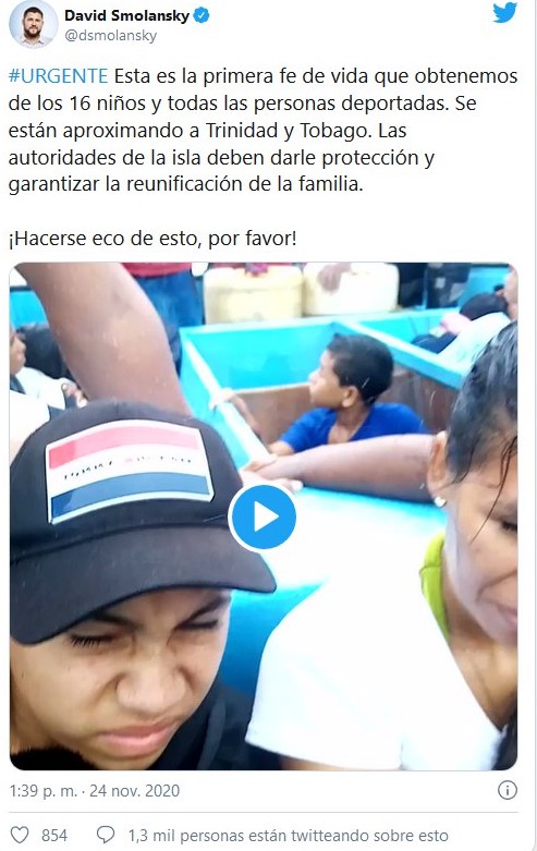 David Smolansky diriente opositor, a través de sus redes sociales difundió las pruebas de fe de vida de los niños, adolescentes y adultos venezolanos deportados de Trinidad y Tobago, y que este martes fueron retornados a la isla.