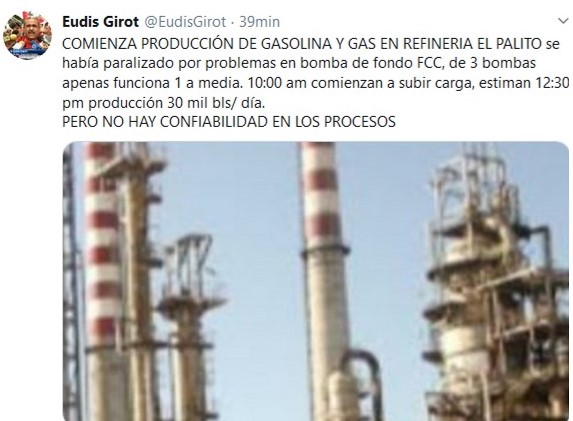 “Comienza producción de gasolina y gas en refinería el palito se había paralizado por problemas en bomba de fondo fcc, de 3 bombas apenas funciona 1 a media. 10:00 am comienzan a subir carga, estiman 12:30 pm producción 30 mil bls/ día. pero no hay confiabilidad en los procesos”, twitteó Girot.