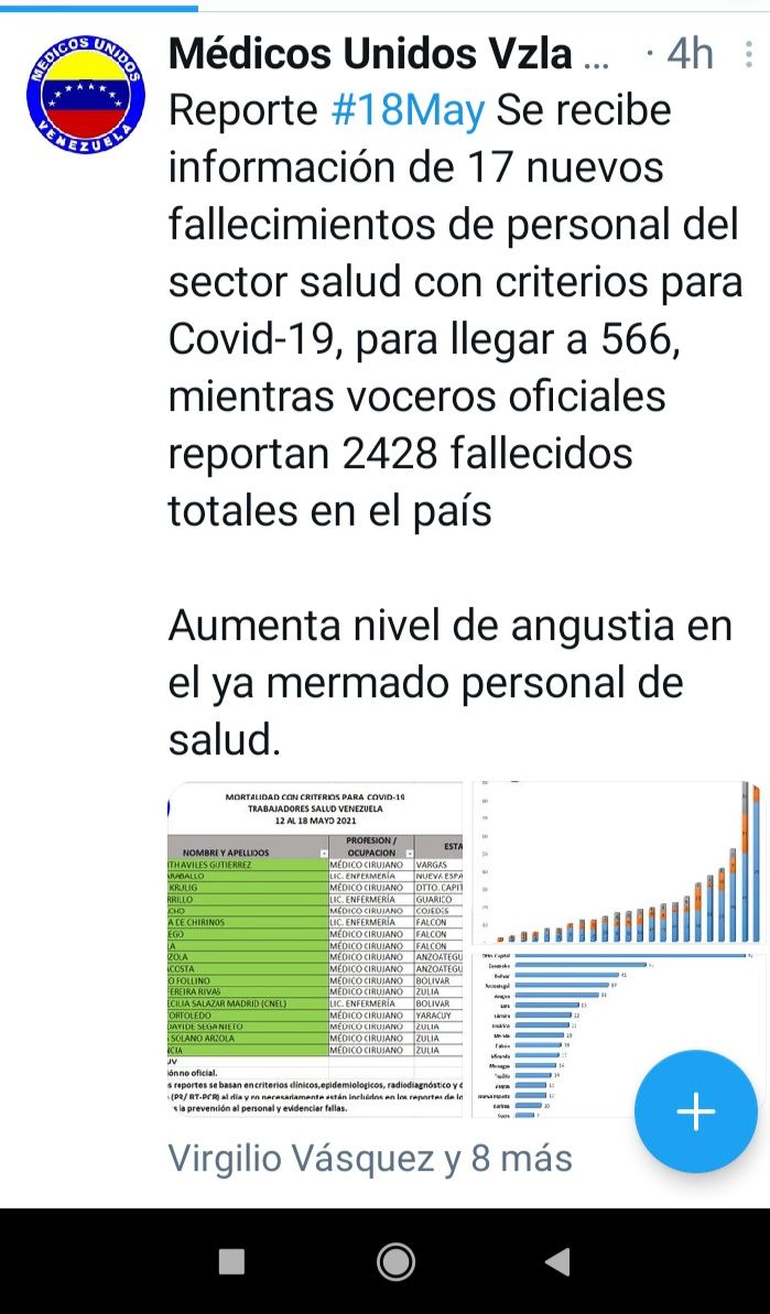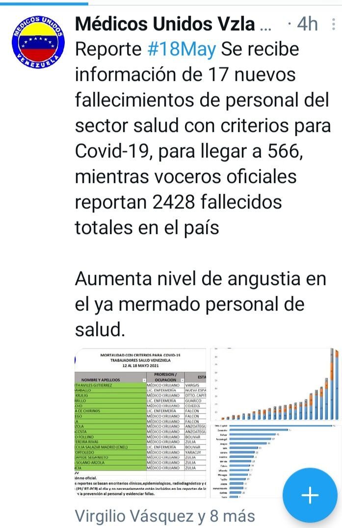 La Organización No Gubernamental (ONG) Médicos Unidos Venezuela, informó este 19 de mayo el fallecimiento de 17 nuevos doctores a causa delCOVID-19, para un total de 566 profesionales de la salud muerto a causa de este virus que ataca a la humanidad.