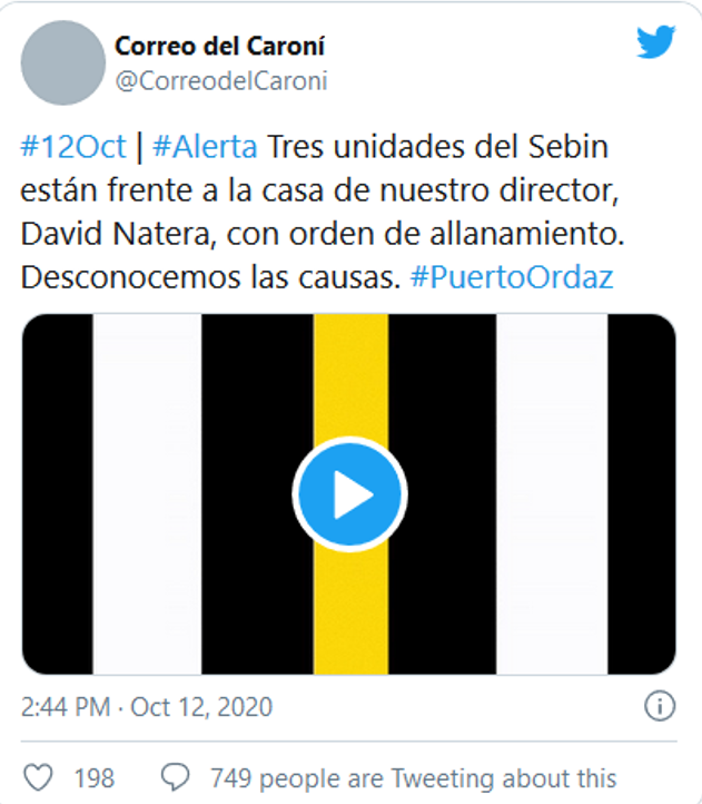 David Natera Febres quien funge como director del diario Correo del Caroní ubicado en Ciudad Guayana en el estado Bolívar, recibió la visita de funcionarios del Sebin, según reportaron en sus redes sociales.