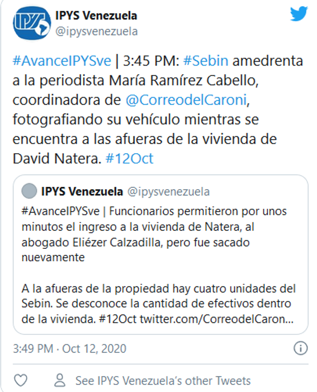 Por otro lado, el Instituto de Prensa y Sociedad IPYS aseveró que la periodista María Ramírez Cabello coordinadora del Correo del Caroní se le fue también fotografiado su vehículo estando en la casa de el director del diario.
