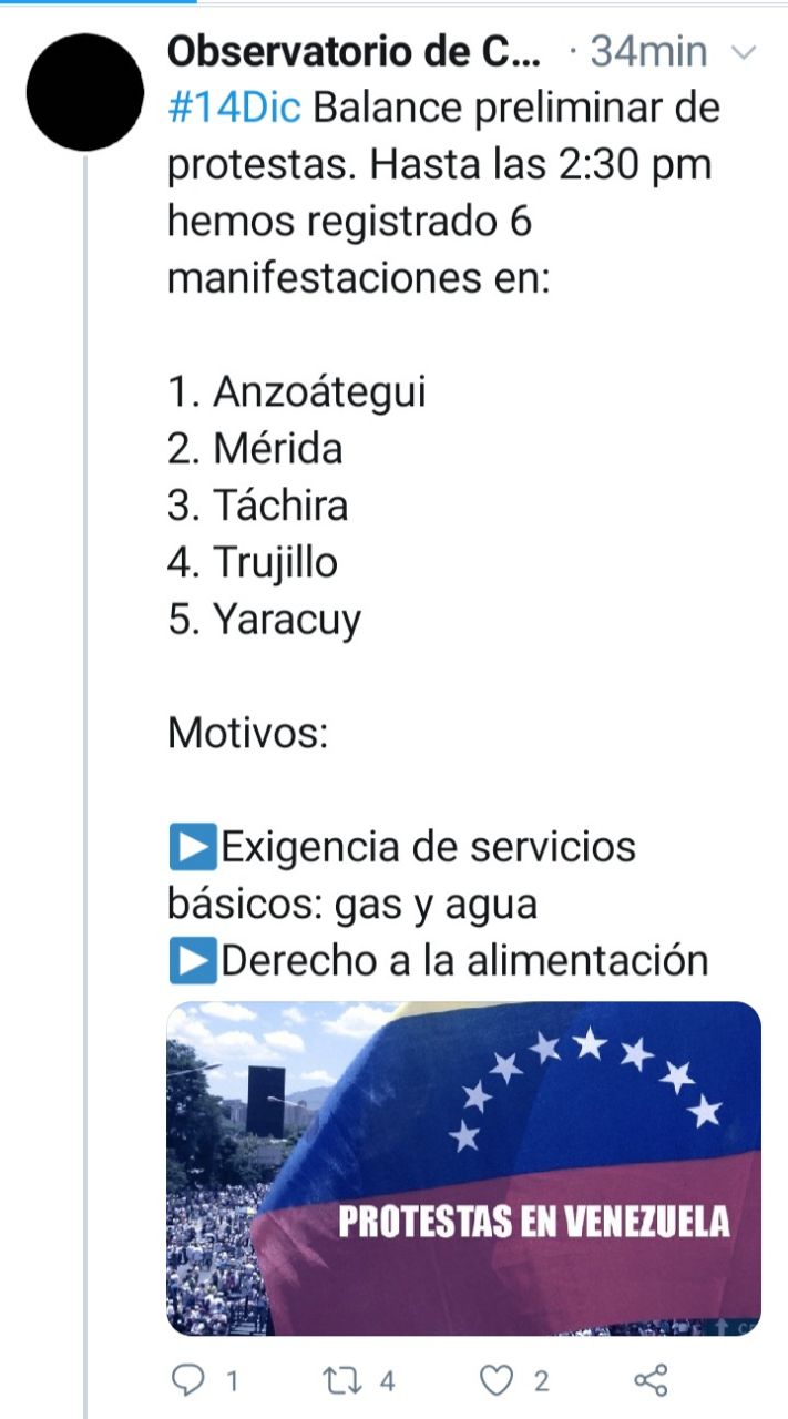 Para exigir mejoras en los servicios básicos como agua y gas, cinco estados de Venezuela se levantaron en protesta este lunes 14 de diciembre.
