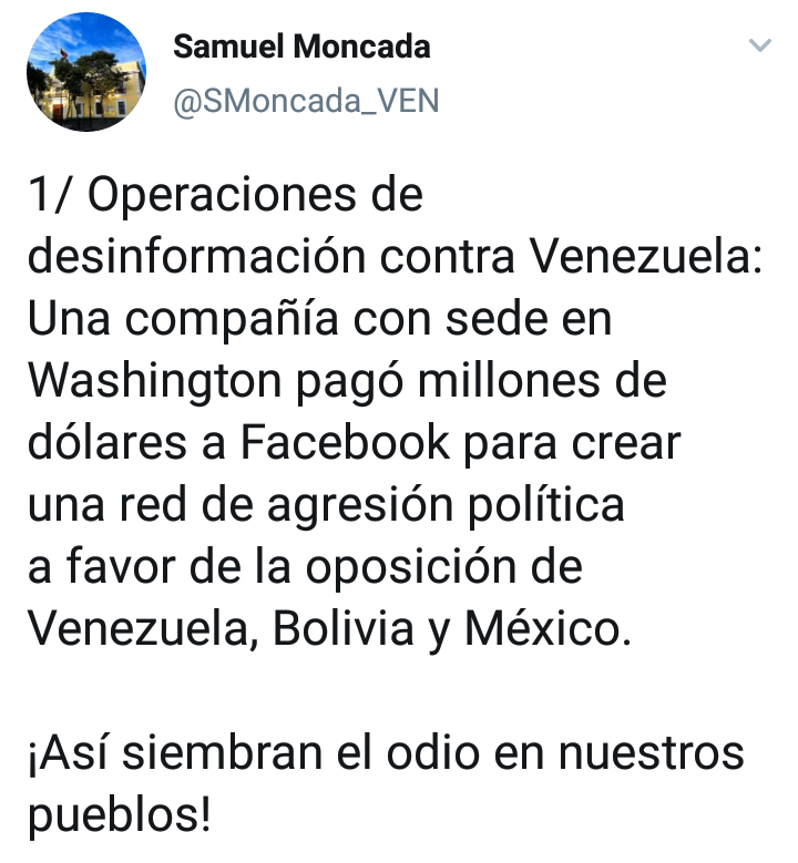 «Operaciones de desinformación contra Venezuela: Una compañía con sede en Washington pagó millones de dólares a Facebook para crear una red de agresión política a favor de la oposición de Venezuela, Bolivia y México.