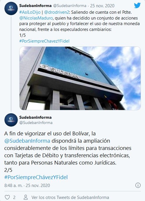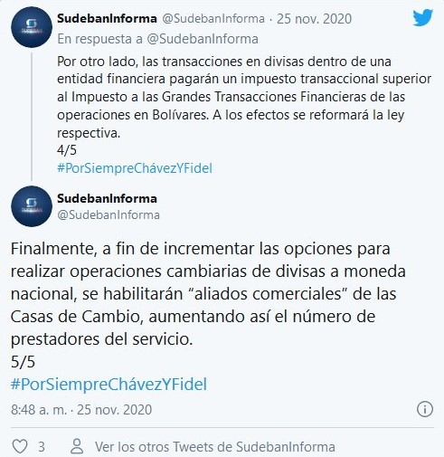 Por último la Sudeban, informó que se subirán las opciones para realizar operaciones cambiarias de divisas a la moneda nacional a través de 2aliados comerciales» como las casas de cambio.