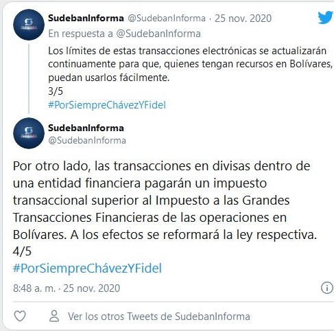 Asimismo, las operaciones en divisas dentro de una entidad financiera cancelarán un impuesto transaccional superior al impuesto a las Grandes Transacciones Financieras de las operaciones en bolívares.