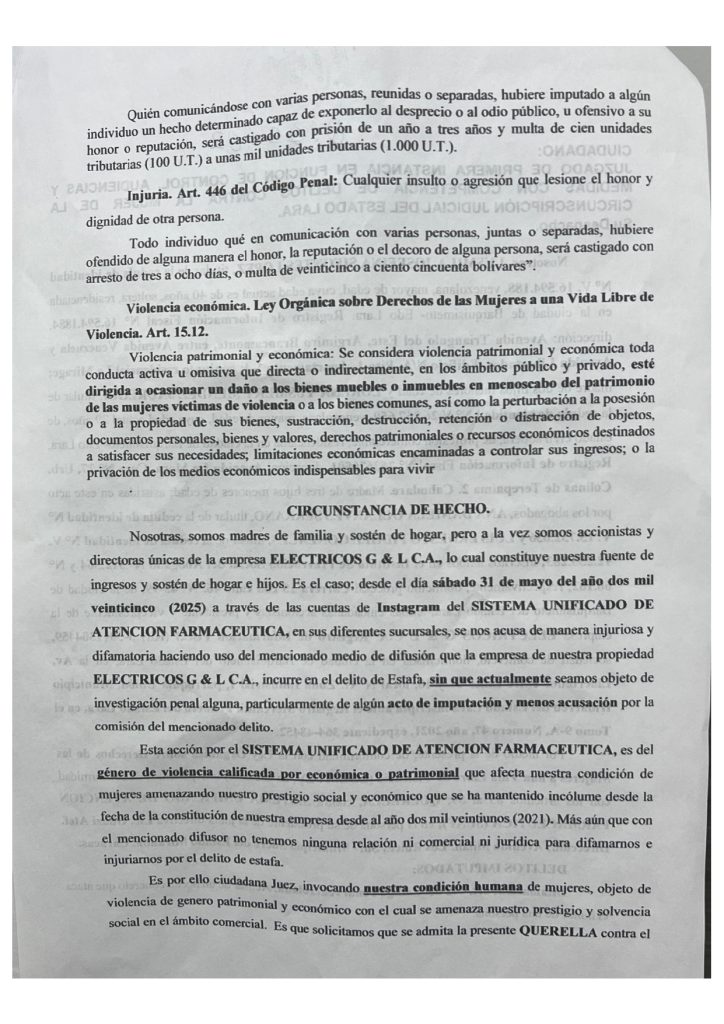 FUNCION DE CONTROL, AUDIENCIAS Y MEDIDAS CON COMPETENCIA DE DELITOS CONTRA LA MUJER DE LA CIRCUNSCRIPCIÓN JUDICIAL DEL ESTADO LARA, (se adjunta copias fotostática) porque constituye delitos de violencia de genero de carácter patrimonial previsto en el artículo 15. Numeral 12, de la Ley Orgánica sobre Derechos de las Mujeres a una Vida Libre de Violencia; todo ello, con la finalidad de que sea investigado y concluir en la responsabilidad penal que ha incurrido el Sistema Unificado de Atención Farmacéutica (SUAF) que difunde a través de la red social Instagram términos injuriosos y difamatorios que acarrean responsabilidad penal. De conformidad con el Código Orgánico Procesal Penal. Así también informamos que se han promovido tumultos a las afueras de Nuestra empresa; sin mediar razón alguna; con la finalidad de desprestigiar a sus accionistas y directoras como también poner en peligro la estabilidad laboral particularmente el ingreso que devenga nuestros empleados y obreros.