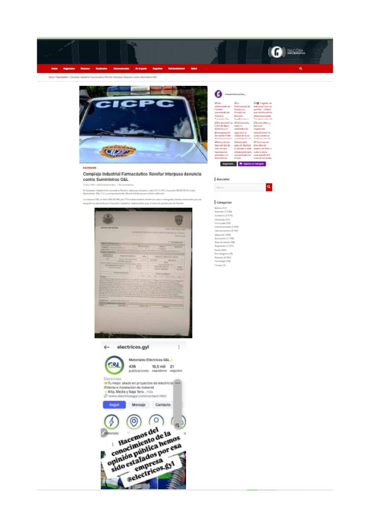 Por medio de la presente, y en ejercicio del derecho a réplica, contemplado en el artículo 58, de la Constitución de la República Bolivariana de Venezuela, que asiste a ELÉCTRICOS G&L C,A, contemplado en la legislación vigente, nos dirigimos a usted con el fin de desmentir y precisar la información publicada en el medio “FALCÓN INFORMATIVA” en su edición del día 2 de junio de 2025, bajo el titular ‘Complejo Industrial Farmacéutico Revofar interpuso denuncia contra Suministros G&L’.